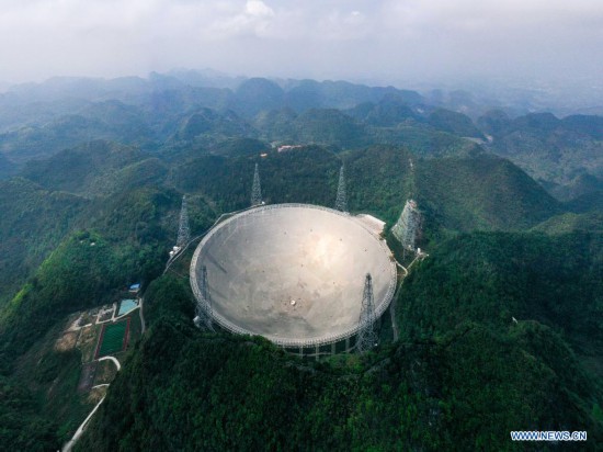 Aerial photo taken on March 28, 2021 shows China's Five-hundred-meter Aperture Spherical radio Telescope (FAST) under maintenance in southwest China's Guizhou Province. FAST has identified over 300 pulsars so far. Located in a naturally deep and round karst depression in southwest China's Guizhou Province, it officially began operating on Jan. 11, 2020. (Xinhua/Ou Dongqu)