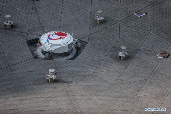 Photo taken on March 29, 2021 shows China's Five-hundred-meter Aperture Spherical radio Telescope (FAST) under maintenance in southwest China's Guizhou Province. FAST has identified over 300 pulsars so far. Located in a naturally deep and round karst depression in southwest China's Guizhou Province, it officially began operating on Jan. 11, 2020. (Xinhua/Ou Dongqu)