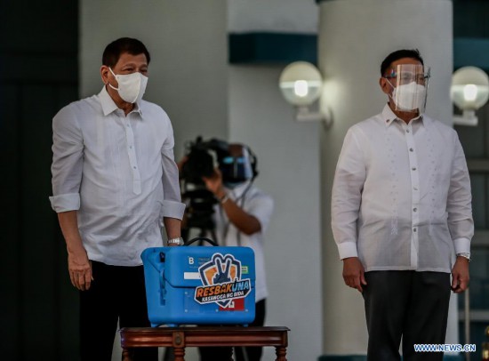 Philippine President Rodrigo Duterte (L) stands beside Health Secretary Francisco Duque as they present a case containing government-purchased Sinovac COVID-19 vaccines in Manila, the Philippines, on March 29, 2021. The Philippines on Monday received the first batch of the Sinovac COVID-19 vaccines its government has purchased from China. (Xinhua/Rouelle Umali)