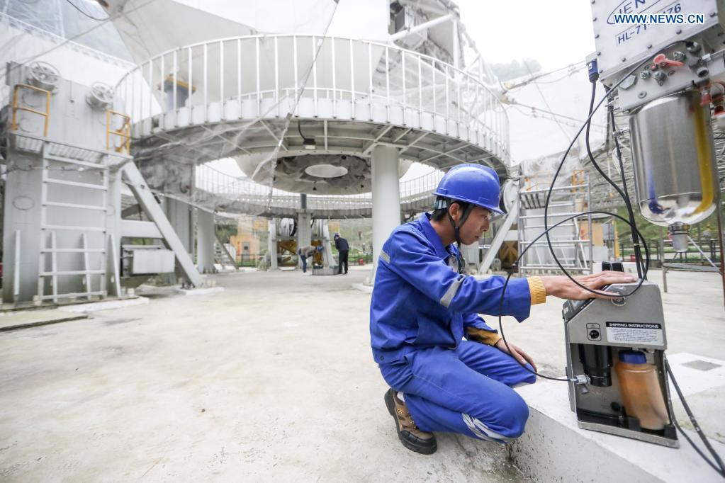 A staff member works during a regular maintenance operation to the Five-hundred-meter Aperture Spherical Radio Telescope (FAST) in Pingtang County, southwest China's Guizhou Province, March 28, 2021. Starting formal operations in Jan. 11, 2020, the FAST is believed to be the largest and most sensitive radio telescope in the world, which has a huge potential for verifying and exploring mysteries of the universe. (Xinhua/Ou Dongqu)