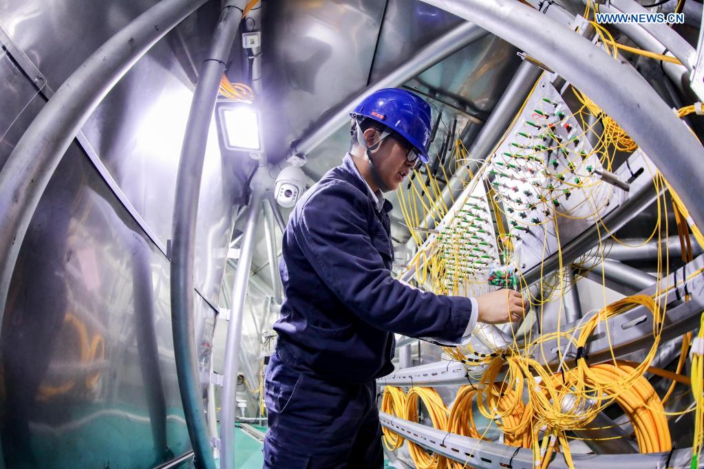 Photo taken with a fisheye lens on March 28, 2021 shows a staff member conducting maintenance work on the feed cabin of the Five-hundred-meter Aperture Spherical Radio Telescope (FAST) in Pingtang County, southwest China's Guizhou Province. Starting formal operations in Jan. 11, 2020, the FAST is believed to be the largest and most sensitive radio telescope in the world, which has a huge potential for verifying and exploring mysteries of the universe. (Xinhua/Ou Dongqu)