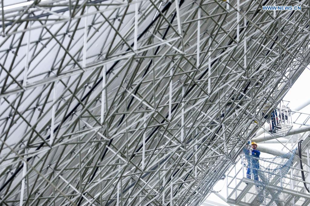 Staff members check the reflector panels during a regular maintenance operation to the Five-hundred-meter Aperture Spherical Radio Telescope (FAST) in Pingtang County, southwest China's Guizhou Province, March 28, 2021. Starting formal operations in Jan. 11, 2020, the FAST is believed to be the largest and most sensitive radio telescope in the world, which has a huge potential for verifying and exploring mysteries of the universe. (Xinhua/Ou Dongqu)