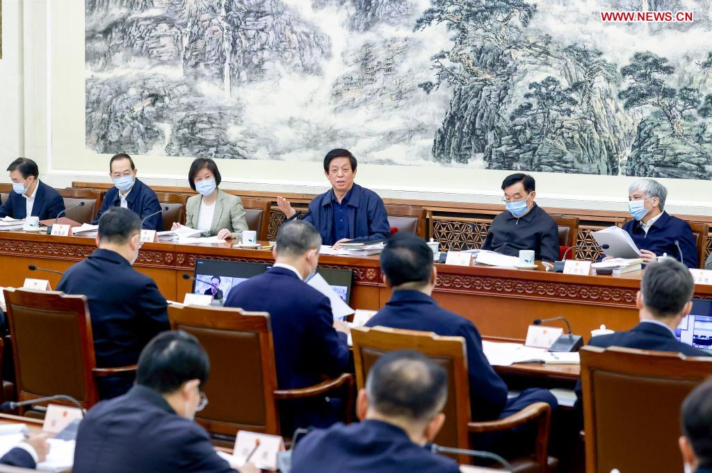 Li Zhanshu, chairman of the National People's Congress Standing Committee and a member of the Standing Committee of the Political Bureau of the Communist Party of China Central Committee, presides over the first plenary meeting of the teams of lawmakers to inspect the enforcement of the Law on Prevention and Control of Environmental Pollution by Solid Waste in Beijing, capital of China, March 29, 2021. (Xinhua/Ding Lin)