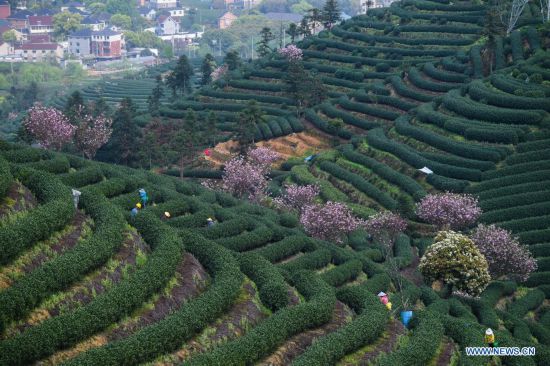 Photo taken on March 29, 2021 shows farmers picking tea leaves near by cherry blossoms in a tea garden at Bashan Village, Fuyang District, Hangzhou City in east China's Zhejiang Province. (Xinhua/Xu Yu)
