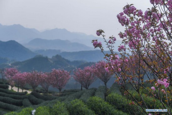 Photo taken on March 29, 2021 shows a view of cherry blossoms in a tea garden at Bashan Village, Fuyang District, Hangzhou City in east China's Zhejiang Province. (Xinhua/Xu Yu)