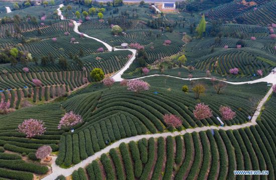 Aerial photo taken on March 29, 2021 shows a view of cherry blossoms in a tea garden at Bashan Village, Fuyang District, Hangzhou City in east China's Zhejiang Province. (Xinhua/Xu Yu)
