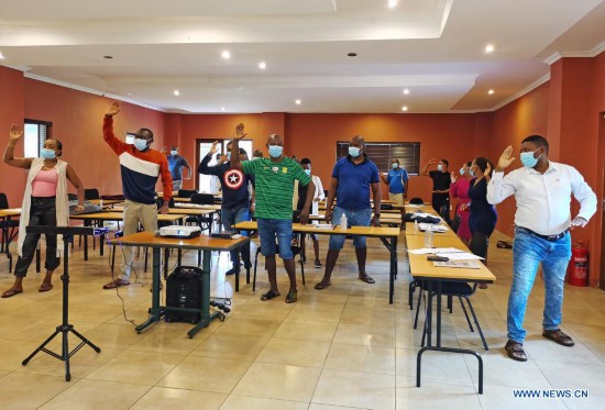 South African tourist guides attend an online Chinese martial arts lesson offered by the University of Johannesburg-Nanjing Technology University Confucius Institute in Pretoria, South Africa, Feb. 1, 2021. "Ni wen wo ai ni you duo shen, yue lian dai biao wo de xin (You asked me how much I loved you, the moon can represent my heart)." When hearing this Chinese song, you can hardly believe that it was sung by a group of South African tourist guides who have been learning mandarin for only two months. These 20 tourists guides were selected from all over the country by the Department of Tourism and accepted the mandarin training supplied by the University of Johannesburg-Nanjing Technology University Confucius Institute. During the training, they learned mandarin, enjoyed Chinese culture and shared their achievement and happiness with their peers. (Xinhua/Chen Cheng)