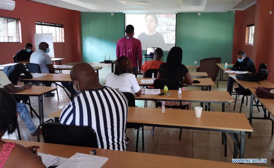 South African tourist guides attend an online Mandarin lesson offered by the University of Johannesburg-Nanjing Technology University Confucius Institute in Pretoria, South Africa, Feb. 1, 2021. "Ni wen wo ai ni you duo shen, yue lian dai biao wo de xin (You asked me how much I loved you, the moon can represent my heart)." When hearing this Chinese song, you can hardly believe that it was sung by a group of South African tourist guides who have been learning mandarin for only two months. These 20 tourists guides were selected from all over the country by the Department of Tourism and accepted the mandarin training supplied by the University of Johannesburg-Nanjing Technology University Confucius Institute. During the training, they learned mandarin, enjoyed Chinese culture and shared their achievement and happiness with their peers. (Xinhua/Chen Cheng)