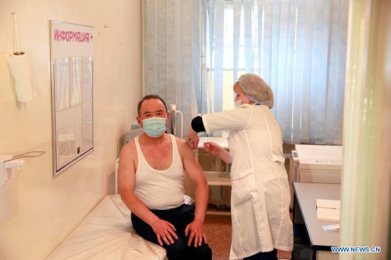 A man receives a shot of Chinese COVID-19 vaccine in Bishkek, capital of Kyrgyzstan, March 29, 2021. The first stage of a COVID-19 vaccination campaign using Chinese vaccines kicked off in Kyrgyzstan on Monday. Minister of Health and Social Development of the country Alymkadyr Beishenaliev and his deputies were the first who received the vaccination. (Photo by Roman/Xinhua)