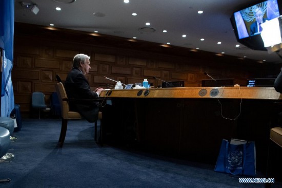 UN Secretary-General Antonio Guterres addresses a high-level event on debt and liquidity at the UN headquarters in New York, March 29, 2021. UN Secretary-General Antonio Guterres on Monday called for urgent, bold measures to address an emerging debt crisis caused largely by COVID-19. (Eskinder Debebe/UN Photo/Handout via Xinhua)