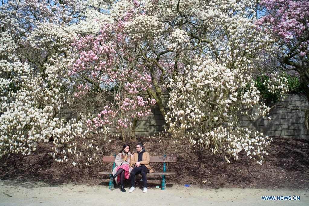 People take a rest under magnolia flowers at the Laeken Park in Brussels, Belgium, March 28, 2021. (Xinhua/Zhang Cheng)