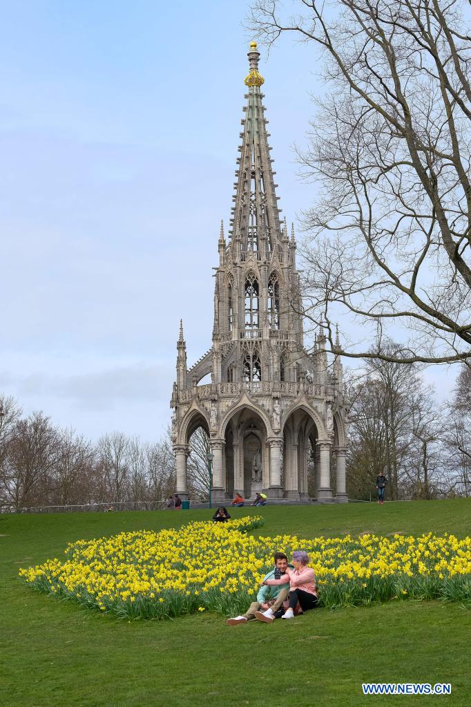 People take selfies among flourishing narcissi at the Laeken Park in Brussels, Belgium, March 28, 2021. (Xinhua/Zhang Cheng)