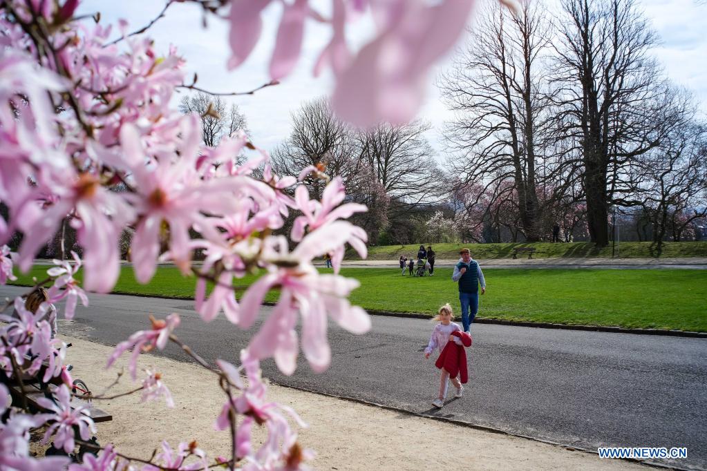 People view magnolia flowers at the Laeken Park in Brussels, Belgium, March 28, 2021. (Xinhua/Zhang Cheng)