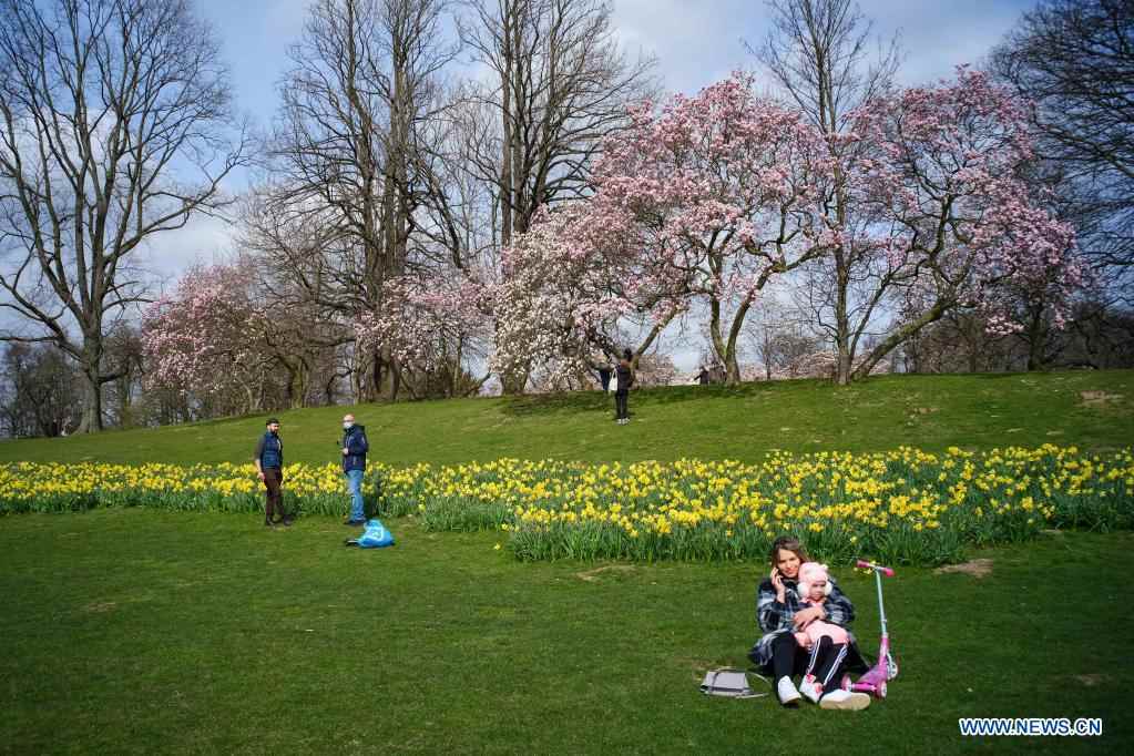 People view flowers at the Laeken Park in Brussels, Belgium, March 28, 2021. (Xinhua/Zhang Cheng)