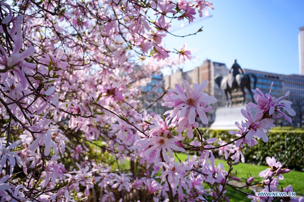 Photo taken on March 29, 2021 shows magnolia flowers in Brussels, Belgium. (Xinhua/Zhang Cheng)