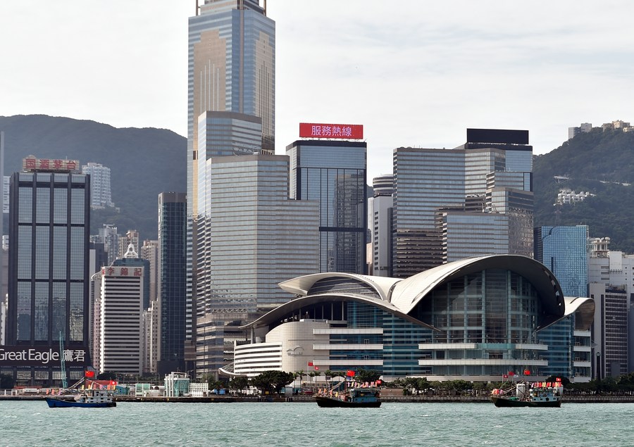 Vessels with Chinese national flag and the flag of the Hong Kong Special Administrative Region sail in a procession to celebrate the 71st anniversary of the founding of the People's Republic of China and the Mid-Autumn Festival at the Victoria Harbour in Hong Kong, south China, Oct. 1, 2020. (Xinhua/Lo Ping Fai)