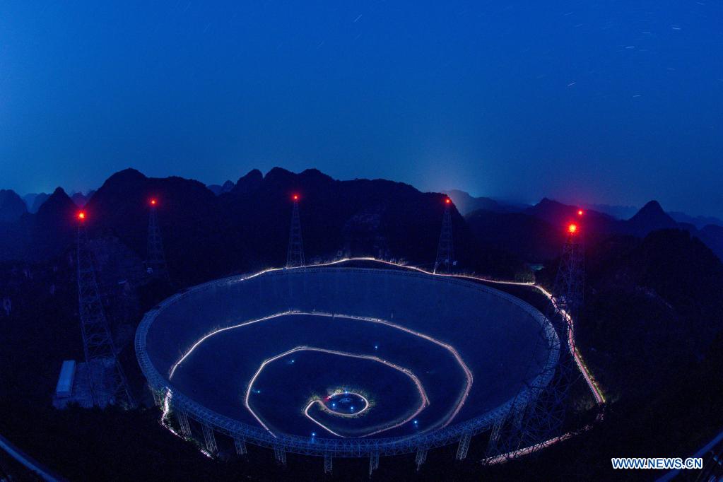 Photo taken on March 30, 2021 shows China's Five-hundred-meter Aperture Spherical Radio Telescope (FAST) under maintenance at night in southwest China's Guizhou Province. China's Five-hundred-meter Aperture Spherical Radio Telescope (FAST) officially opened to the world starting Wednesday. (Xinhua/Ou Dongqu)