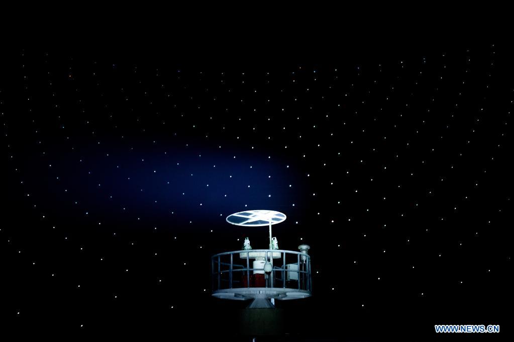 Photo taken on March 29, 2021 shows China's Five-hundred-meter Aperture Spherical Radio Telescope (FAST) under maintenance at night in southwest China's Guizhou Province. China's Five-hundred-meter Aperture Spherical Radio Telescope (FAST) officially opened to the world starting Wednesday. (Xinhua/Ou Dongqu)