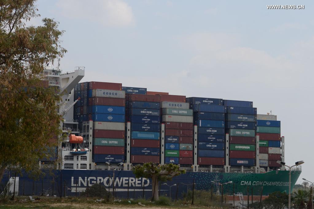 Photo taken on March 30, 2021 shows a ship sailing on the Suez Canal, Egypt. At least 113 container ships have passed through the Suez Canal that was blocked by a massive cargo container, chairman of the Suez Canal Authority (SCA) Osama Rabie said on Tuesday. (Xinhua/Ahmed Gomaa)
