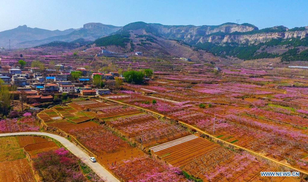 Aerial photo taken on March 30, 2021 shows peach blossoms in Jinan, east China's Shandong Province. (Xinhua/Zhu Zheng)