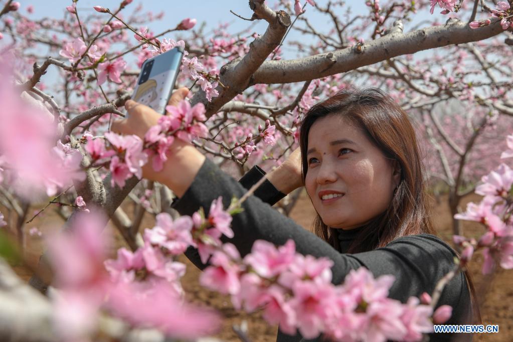 A tourist takes selfies with peach blossoms in Jinan, east China's Shandong Province, March 30, 2021. (Xinhua/Zhu Zheng)