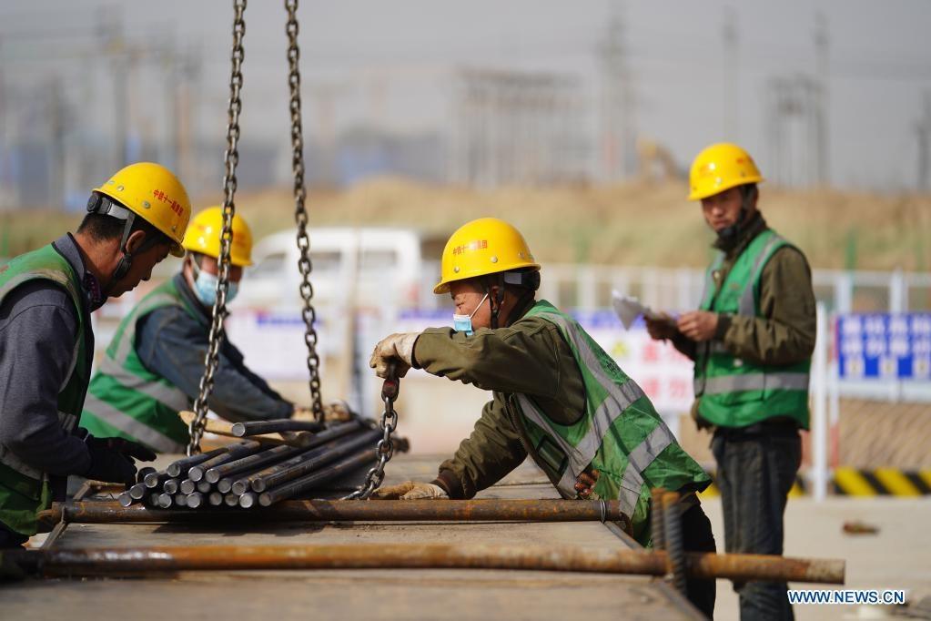 People work at a construction site of municipal supporting facilities in Rongdong area of Xiongan New Area, north China's Hebei Province, March 30, 2021. (Xinhua/Xing Guangli)
