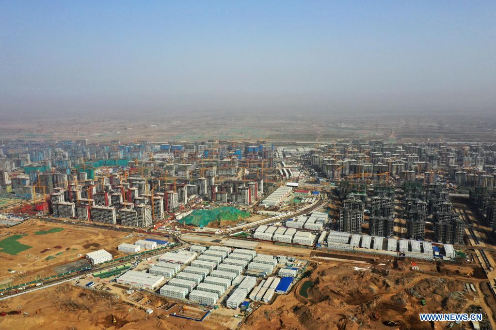 Aerial photo taken on March 30, 2021 shows a construction site in Rongdong area of Xiongan New Area, north China's Hebei Province. (Xinhua/Xing Guangli)