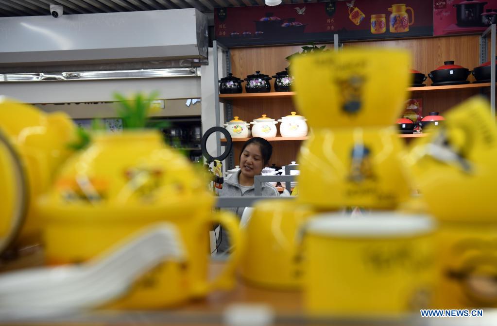 A woman promotes products via livestreaming in Baigou New Township of Baoding, north China's Hebei Province, March 30, 2021. Baigou New Township have established livestreaming platforms for local enterprises so as to boost local economy in recent years. (Xinhua/Jin Liangkuai)
