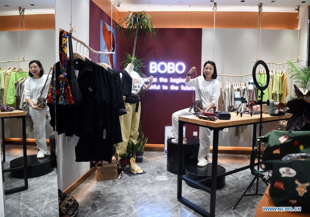 A woman promotes products via livestreaming in Baigou New Township of Baoding, north China's Hebei Province, March 30, 2021. Baigou New Township have established livestreaming platforms for local enterprises so as to boost local economy in recent years. (Xinhua/Jin Liangkuai)