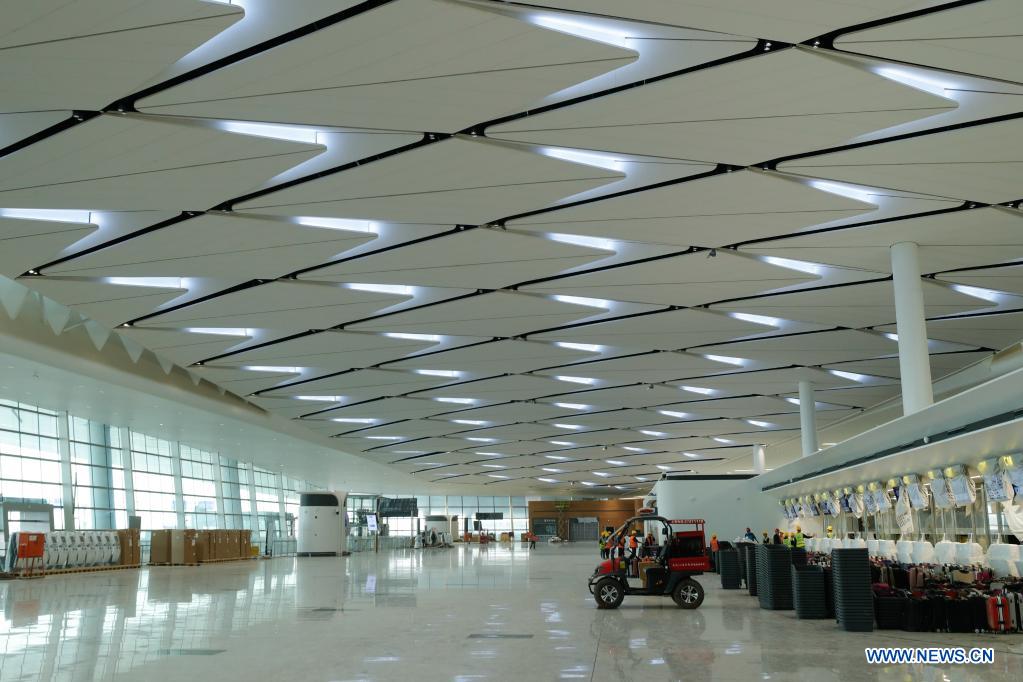 Photo taken on March 30, 2021 shows the interior view of the terminal 1 of Chengdu Tianfu International Airport in Chengdu, southwest China's Sichuan Province. The construction of terminal area of Chengdu Tianfu International Airport was completed on Tuesday. (Xinhua/Liu Mengqi)