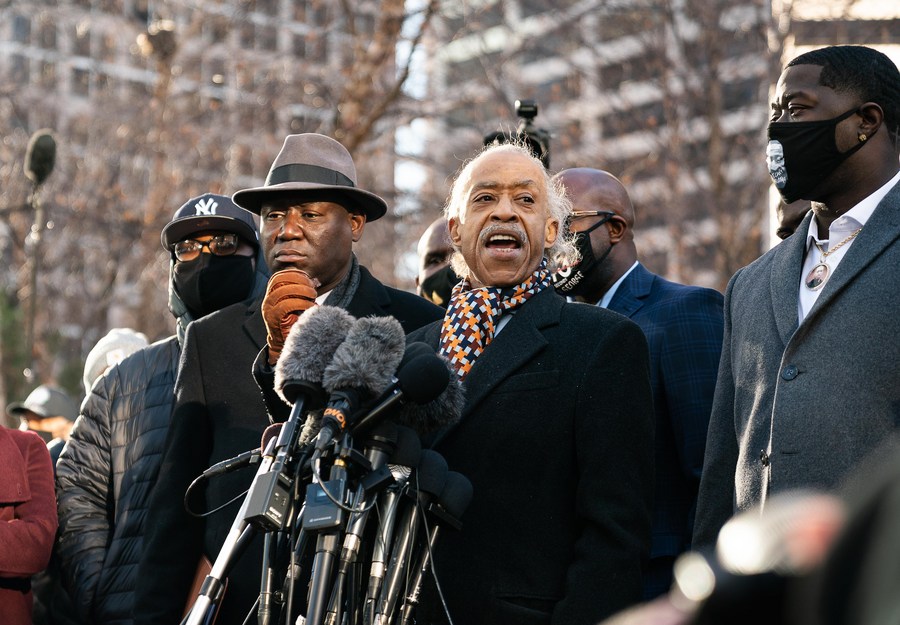 U.S. civil rights activist Al Sharpton (C, front) speaks at a press conference outside the courthouse in Minneapolis, Minnesota, the United States, March 29, 2021. (Photo by Ben Brewer/Xinhua)