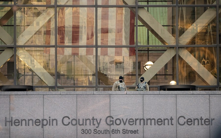 National Guard soldiers are seen near the courthouse in Minneapolis, Minnesota, the United States, March 29, 2021. (Photo by Ben Brewer/Xinhua)