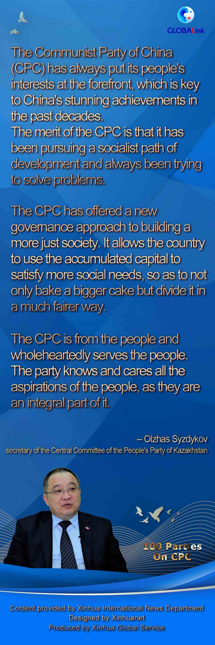 It has been under the leadership of Chinese President Xi Jinping, also general secretary of the CPC Central Committee, that the CPC has achieved its goal of eradicating extreme poverty before the party's 100th founding anniversary this year, the Kazakh politician said, adding that China has also secured economic growth and cracked down on corruption over the past years.
