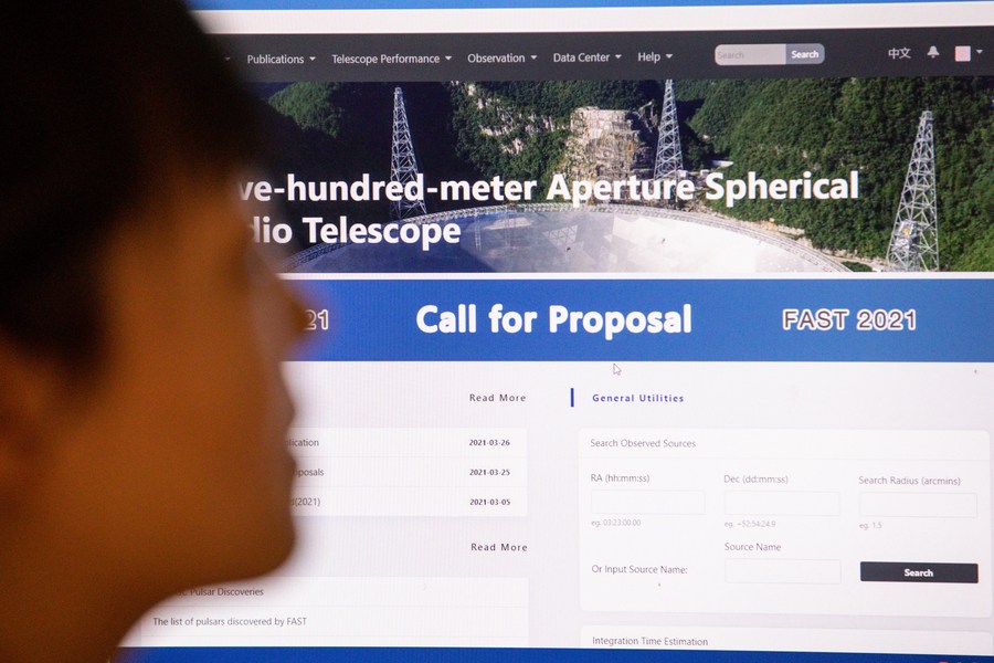 An engineer of China's Five-hundred-meter Aperture Spherical Radio Telescope (FAST) shows the website to submit applications for observations, southwest China's Guizhou Province, March 31, 2021. (Xinhua/Ou Dongqu)
