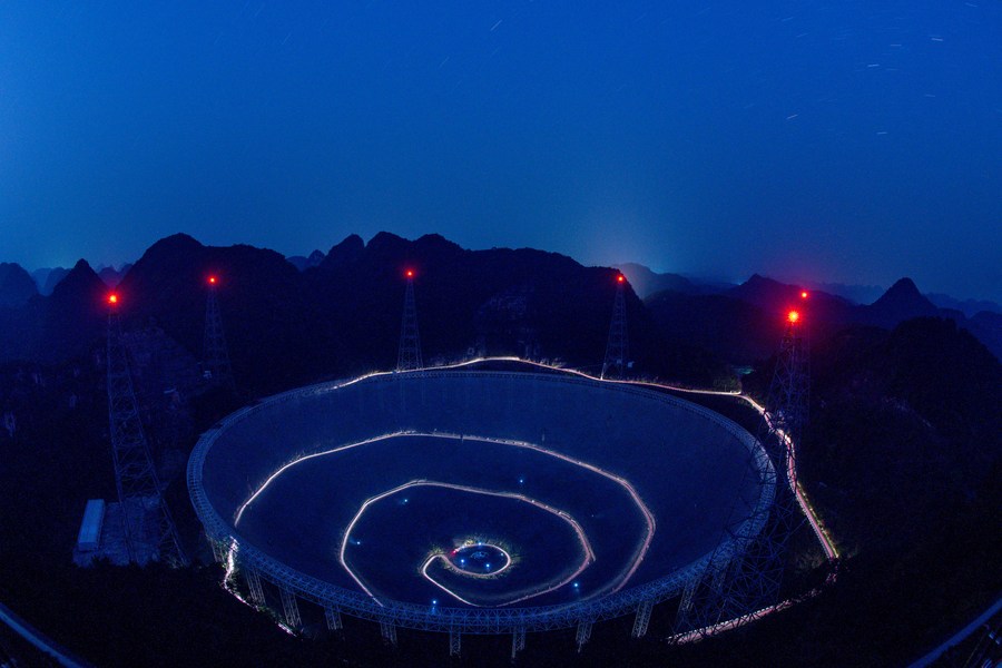 Hand-painting shows China's Five-hundred-meter Aperture Spherical Radio Telescope (FAST) at night in southwest China's Guizhou Province. (Xinhua/Xiao Mengfan, Liu Hongde, Wang Jingyun and Liu Fangqiang)