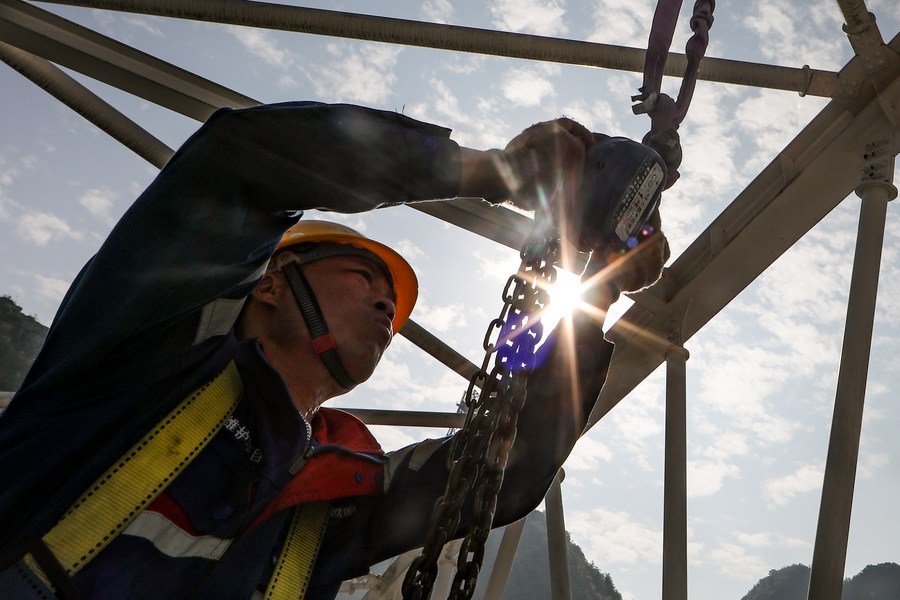 A staff member maintains China's Five-hundred-meter Aperture Spherical Radio Telescope (FAST) in southwest China's Guizhou Province, March 29, 2021. (Xinhua/Ou Dongqu)