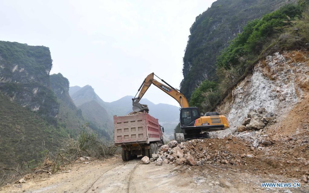 Workers upgrade the condition of the road access to Qibainong Town of Dahua Yao Autonomous County, south China's Guangxi Zhuang Autonomous Region, March 30, 2021. Since 2016, Guangxi has promoted the construction and improvement of rural road network, with 52,900-kilometer roads built to link villages in rural areas. (Xinhua/Huang Xiaobang)