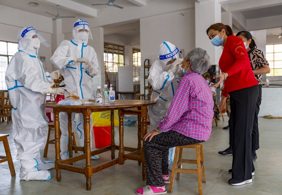 A resident receives nucleic acid testing for COVID-19 at Mengmao Village of Mengmao Township, Ruili City, southwest China's Yunnan Province, March 31, 2021. The city of Ruili on Wednesday launched a city-wide nucleic acid testing for COVID-19 after new cases were reported. (Xinhua/Chen Xinbo)