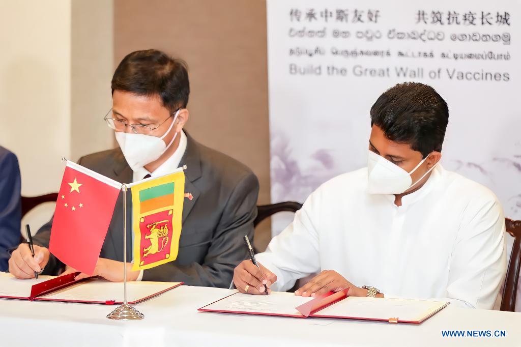 China's Ambassador to Sri Lanka Qi Zhenhong (L) and Sri Lanka's State Minister of Pharmaceutical Production, Supply and Regulation Channa Jayasumana attend an official certificate signing ceremony at the Bandaranaike International Airport in Colombo, Sri Lanka, March 31, 2021. A batch of Sinopharm vaccines arrived in Sri Lanka from China on Wednesday as part of a donation by the Chinese government to the island nation. (Sri Lankan President Media Division/Handout via Xinhua)