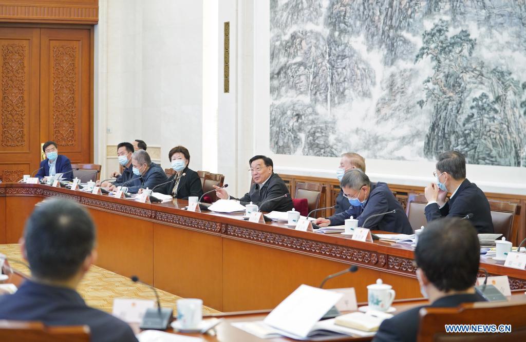 Wang Chen, a member of the Political Bureau of the Communist Party of China Central Committee and vice chairman of the National People's Congress Standing Committee, attends the first plenary meeting of the teams of an enforcement inspection of the Law on Traditional Chinese Medicine (TCM) in Beijing, capital of China, March 31, 2021. (Xinhua/Yue Yuewei)
