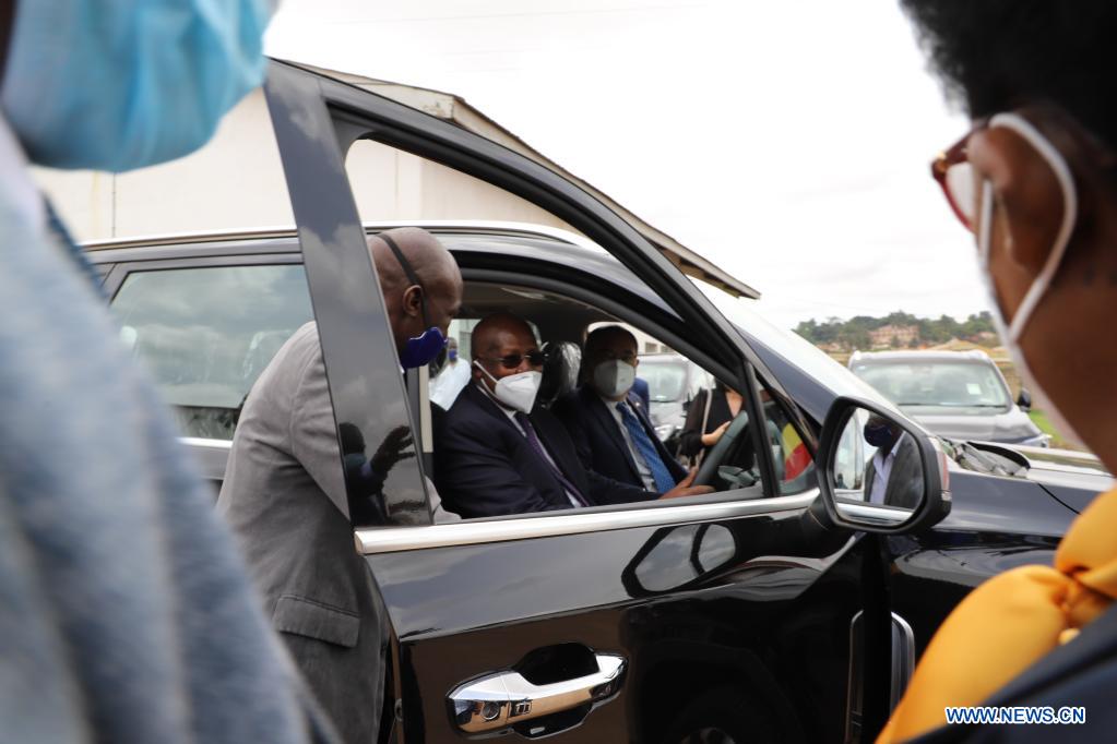 Uganda's Minister of foreign affairs Sam Kutesa (2nd L) tests a motor vehicle with Zheng Zhuqiang (3rd L), Chinese ambassador to Uganda, during a handover ceremony of vehicles donated by China in Kampala, Uganda, March 31, 2021. China on Wednesday handed over 70 vehicles to Uganda which were supposed to be used during the now postponed United Nations G77 plus China Summit. (Xinhua/Zhang Gaiping)