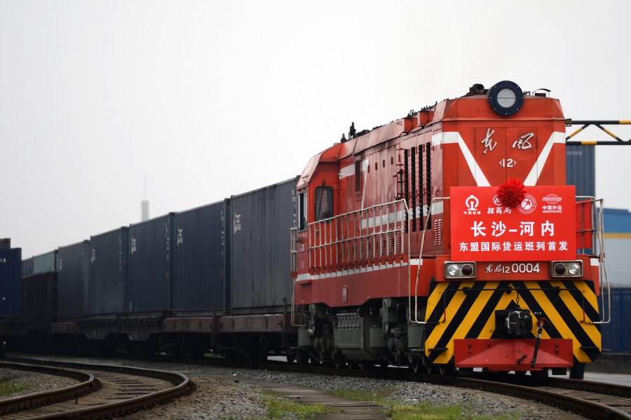 A cargo train loaded with industrial products such as silicon dioxide and hot rolled bars left Changsha, Hunan's capital, Wednesday morning. It will arrive in Hanoi, the capital of Vietnam, in about seven days via south China's Guangxi Zhuang Autonomous Region.