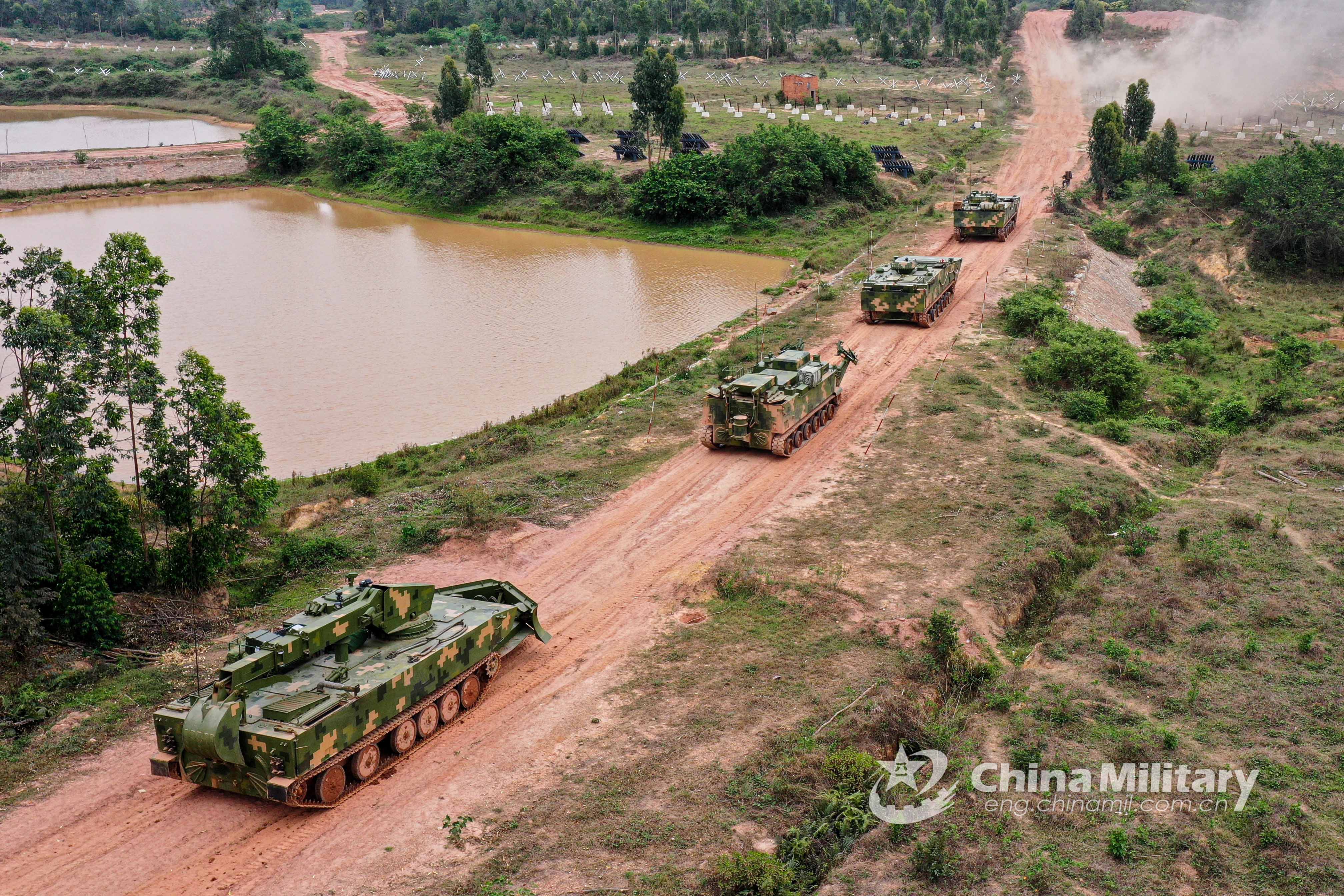 A group of engineering vehicles attached to an engineer element under the PLA 72nd Group Army march forward in hilly area during the breaching training on March 22, 2021. (eng.chinamil.com.cn/Photo by Li Bin)