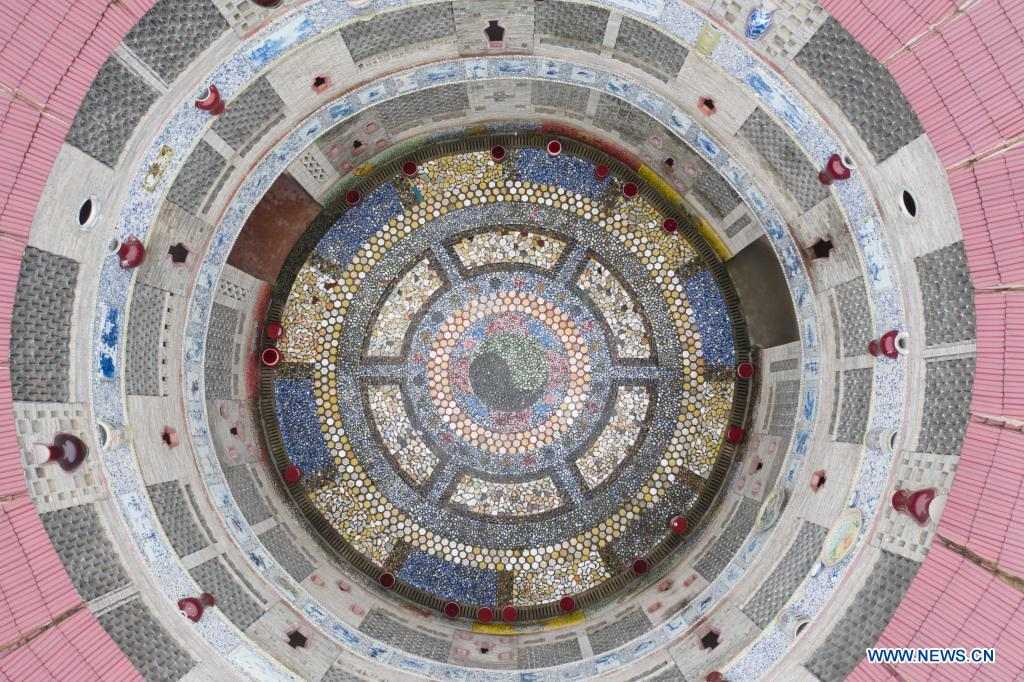Aerial photo taken on March 20, 2021 shows a porcelain palace in Xinping Village of Fuliang County in Jingdezhen, east China's Jiangxi Province. Yu Ermei, a 91-year-old villager who once worked in porcelain factory, started to build her porcelain palaces in Xinping Village from 2011. With her efforts, four buildings decorated with porcelain ware and porcelain pieces now stand in the village, attracting many tourists to visit. (Xinhua/Zhou Mi)