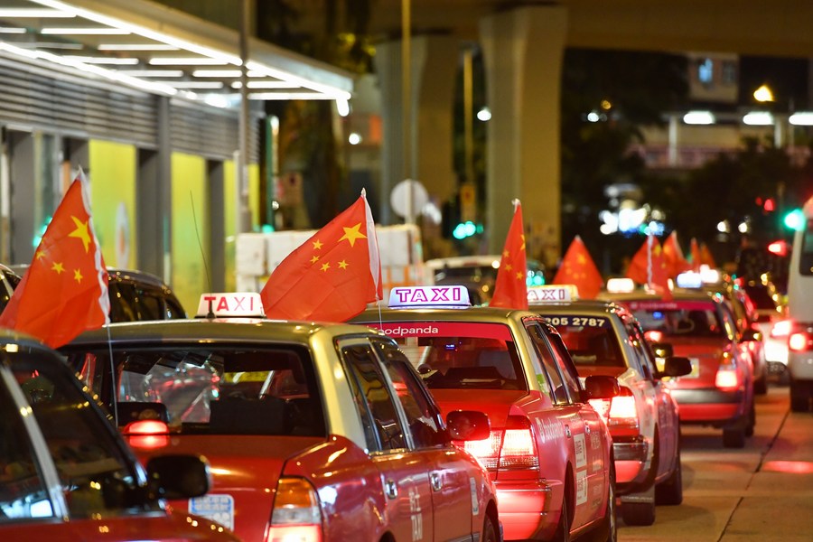 Taxis hanging Chinese national flags participate in a peace rally in Hong Kong, south China, Aug. 23, 2019. (Xinhua/Liu Dawei)