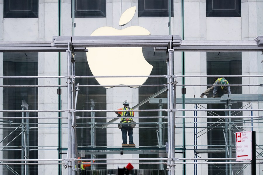 Workers remove the blocks around an Apple store on Fifth Avenue during the Phase one reopening in New York, the United States, June 12, 2020. (Xinhua/Wang Ying)