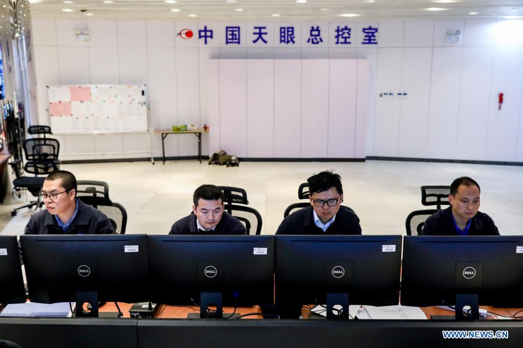 Staff members work at the control room of China's Five-hundred-meter Aperture Spherical Radio Telescope (FAST) in southwest China's Guizhou Province, March 27, 2021. China's FAST officially opened to the world starting Wednesday. (Xinhua/Ou Dongqu)