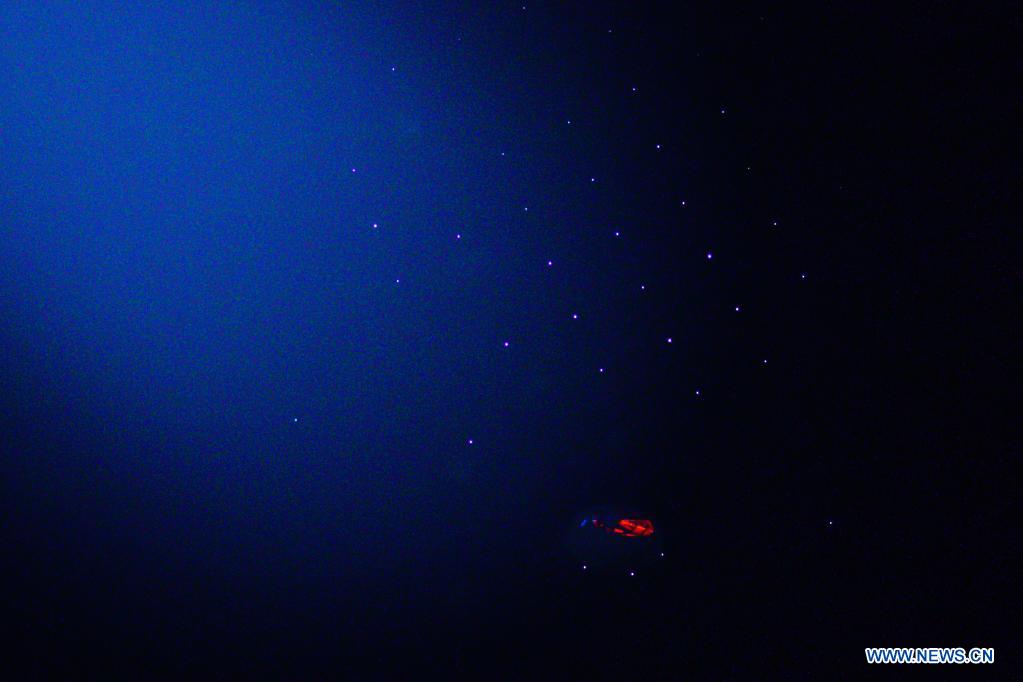 Photo taken on March 28, 2021 shows the feed cabin of China's Five-hundred-meter Aperture Spherical Radio Telescope (FAST) under maintenance at night in southwest China's Guizhou Province. China's FAST officially opened to the world starting Wednesday. (Xinhua/Ou Dongqu)