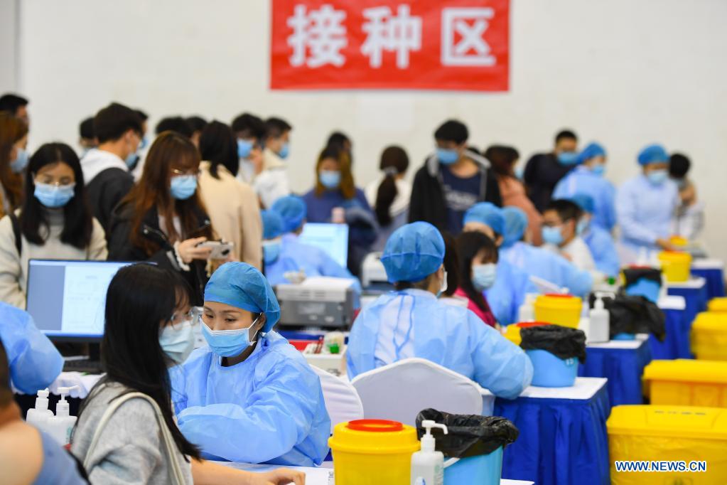 Medical staff from Xiangtan Central Hospital vaccinate teachers and students with COVID-19 vaccines at a temporary inoculation site of Hunan University of Science and Technology in Xiangtan, central China's Hunan Province, April 1, 2021. Recently, Xiangtan Central Hospital has set up a temporary inoculation site for COVID-19 vaccination at Hunan University of Science and Technology. The inoculation site is divided into two areas with 20 inoculation tables, which can vaccinate 20 people at the same time. The hospital plans to vaccinate more than 40,000 teachers and students. (Xinhua/Chen Zeguo)