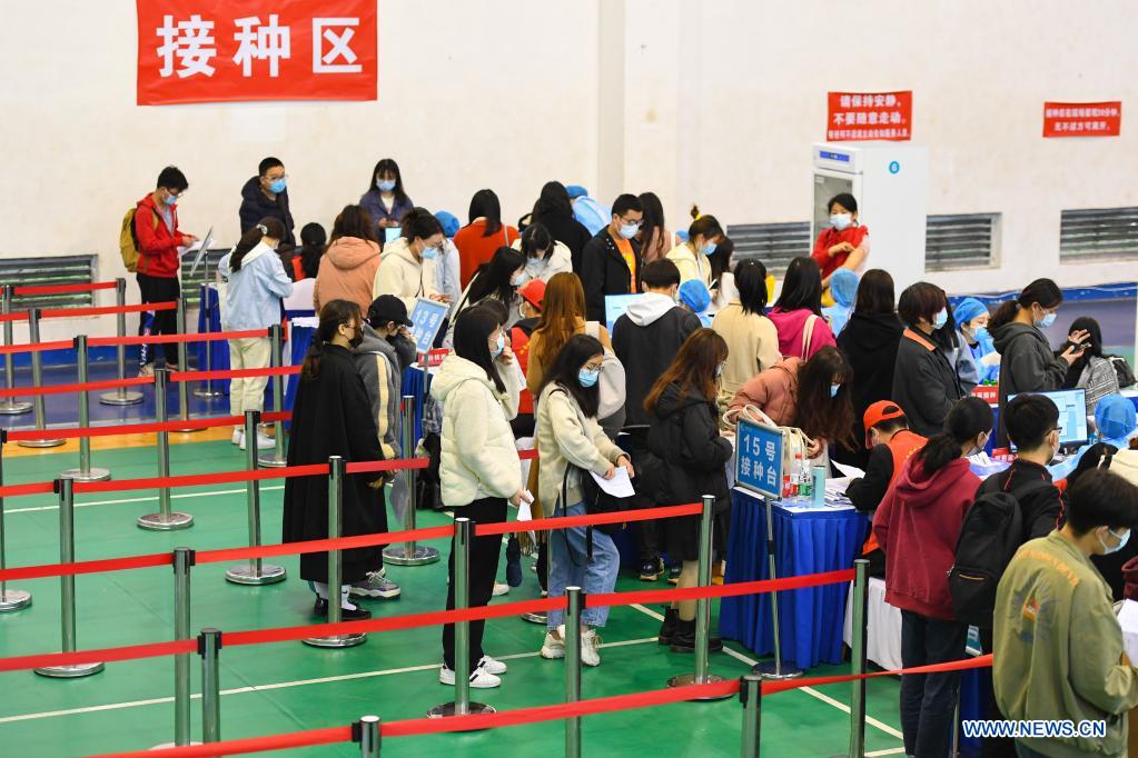 Teachers and students line up to receive COVID-19 vaccines at a temporary inoculation site in Hunan University of Science and Technology in Xiangtan, central China's Hunan Province, April 1, 2021. Recently, Xiangtan Central Hospital has set up a temporary inoculation site for COVID-19 vaccination at Hunan University of Science and Technology. The inoculation site is divided into two areas with 20 inoculation tables, which can vaccinate 20 people at the same time. The hospital plans to vaccinate more than 40,000 teachers and students. (Xinhua/Chen Zeguo)